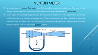 To measure the flow rate that is discharged a pressure drop occurs between the entrance and throat of the venturi meter. Any point of flowing fluid in the venturi meter there will be pressure energy potential energy and kinetic energy. The differential flow meter is the most common device for measu.